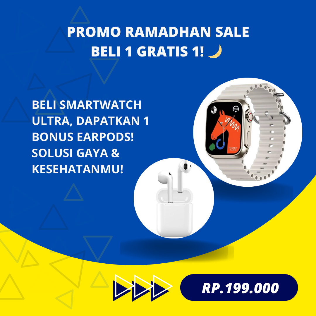 ✅ Jawab: Benar sekali! Ini adalah promo spesial Ramadhan Beli 1 Gratis 1. semisal dengan membeli 1 Smartwatch Ultra, Anda juga akan mendapatkan bonus 2 strap tambahan, 1 Bluetooth Earpods, dan 1 wireless charger. Yuk, manfaatkan promo ini sebelum kehabisan! 🎁